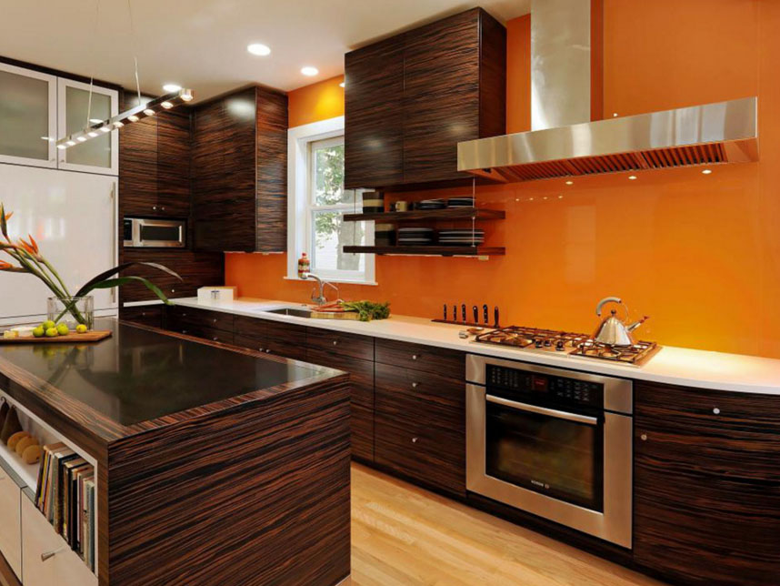 Сделать кухню теплой и элегантной получится, если отдать предпочтение мебели в темных оттенках коричневого. При этом идеальным будет слияние цвета кухонного гарнитура с аналогичным по цвету покрытием пола. Наиболее ярким и солнечным такой дизайн сделает яркая оранжевая стена.