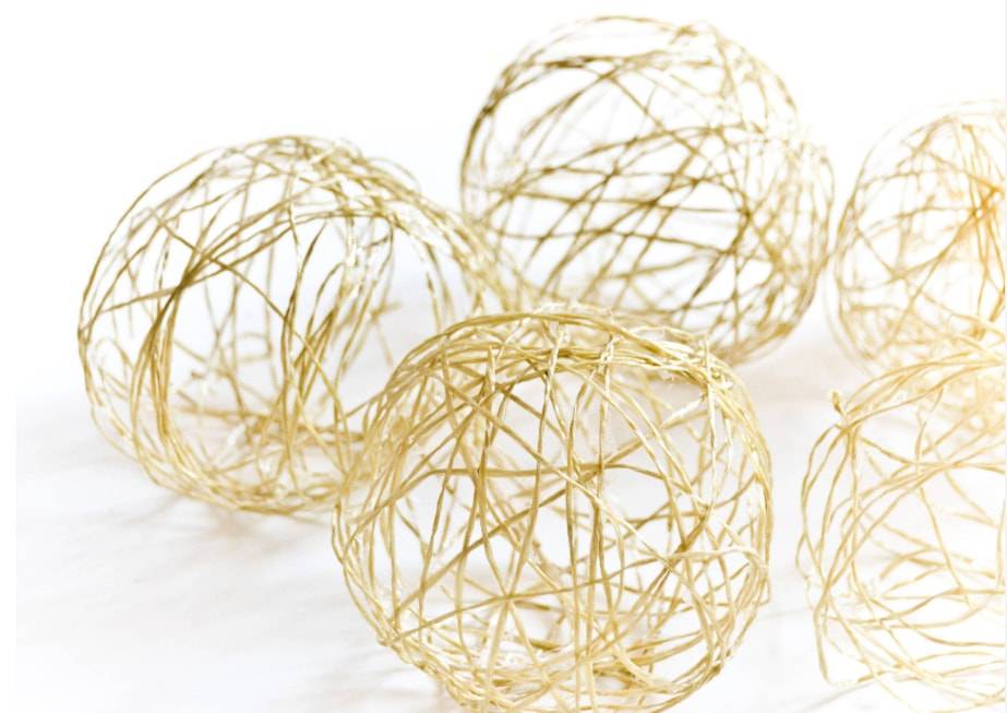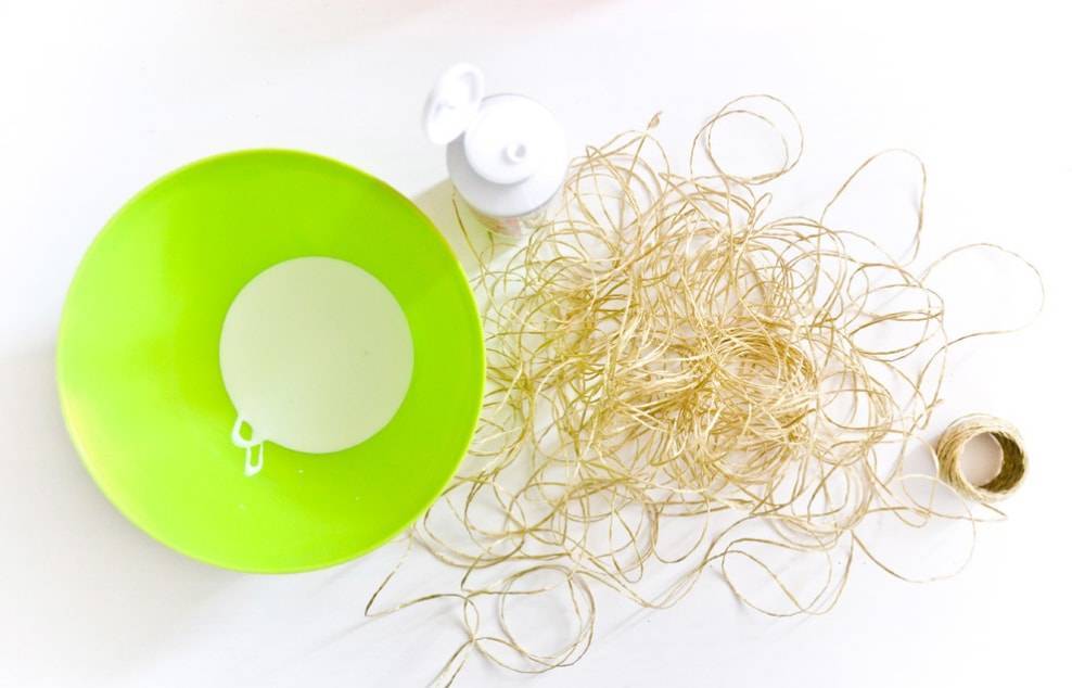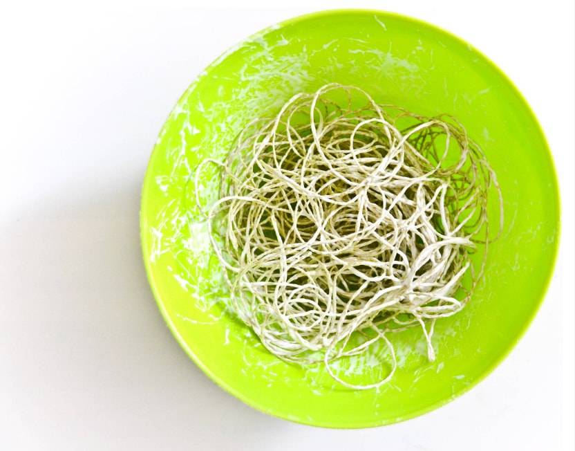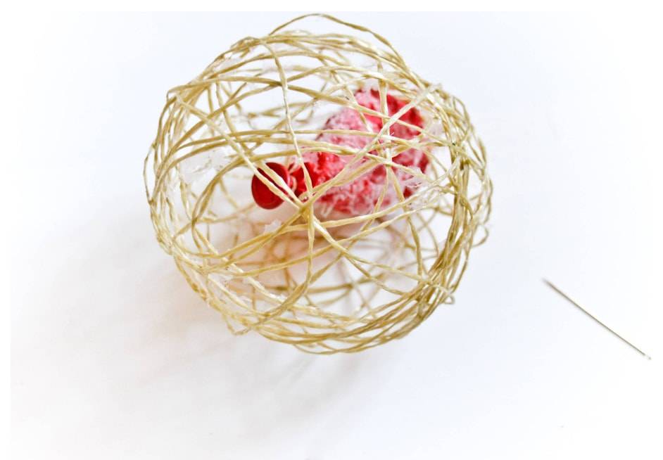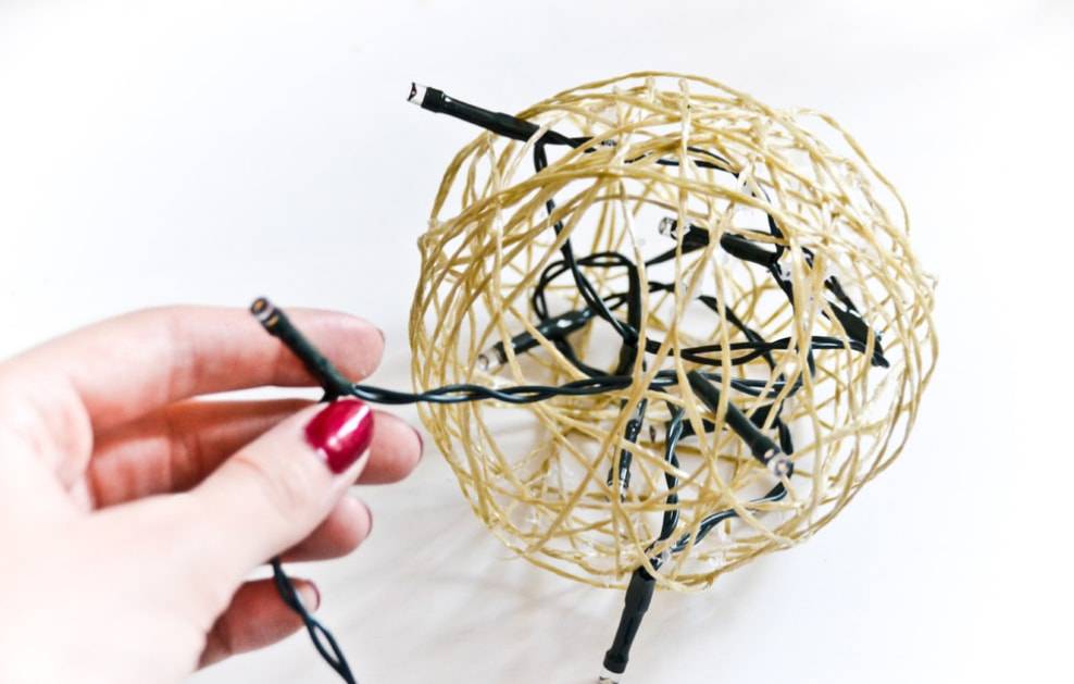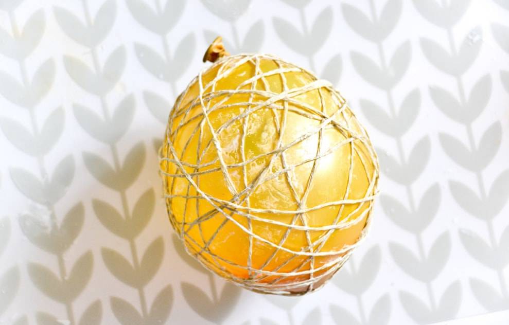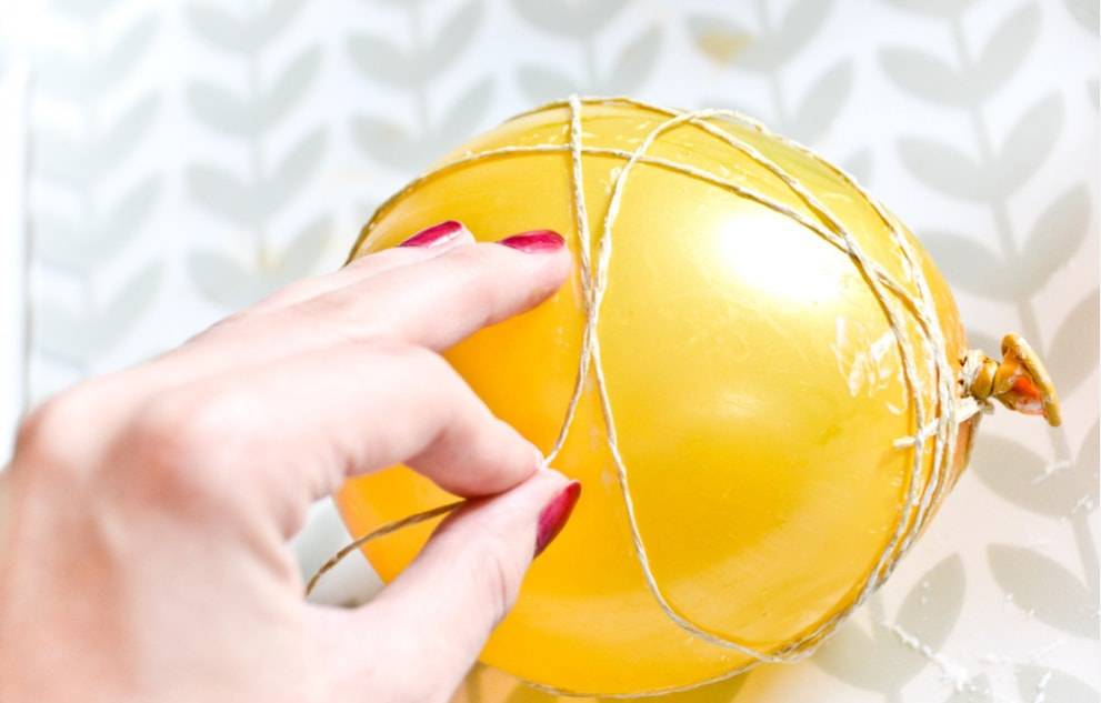 Шаг 3. Для формирования вашей тыквы пропустите нить шпагата через кольца, затем затяните два ее конца и завяжите узел как показано на фото.