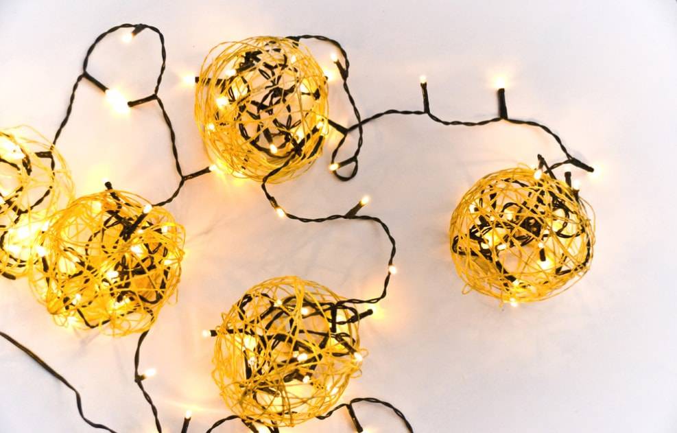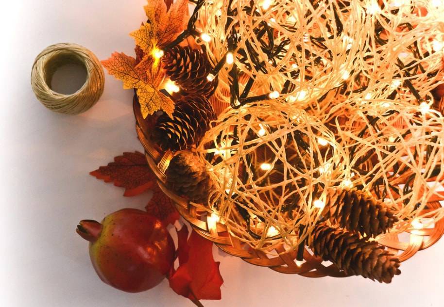 Собираем композицию в корзинку, добавляя шишки, листья и шарики с гирляндой.