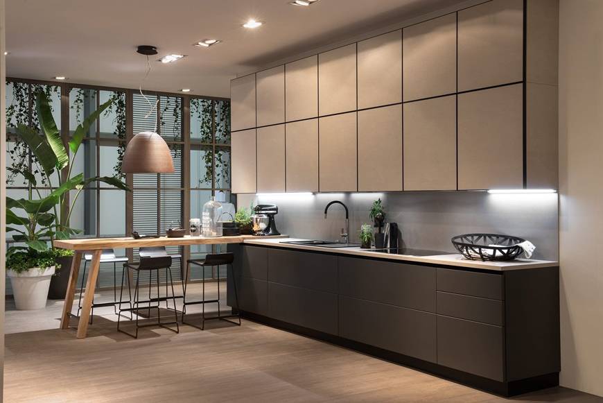 - На подобные дверцы верхнего гарнитура можно не крепить ручки. Необходимо просто сделать сами фасады немного длиннее корпуса, а за выступающую снизу часть открывать и закрывать шкаф. За подобные выступления хорошо прячется подсветка рабочей зоны.