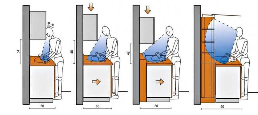 Проектируя различные варианты освещения на кухне, следует учесть такой момент, что источники свет следует размещать в такой последовательности, чтобы от человека, который находится в рабочей зоне, падающая тень не проецировалась на поверхность для работы.