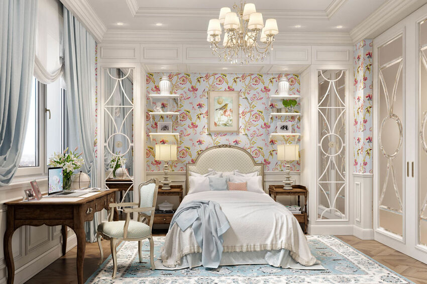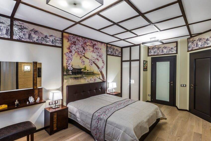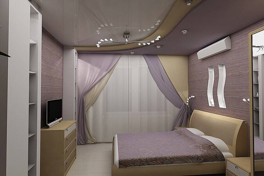 В качестве более оригинального способа украшения потолка рассмотрите зиг-заг или волну, но учтите: свет обязательно должен падать на шкаф с одеждой и зеркало.