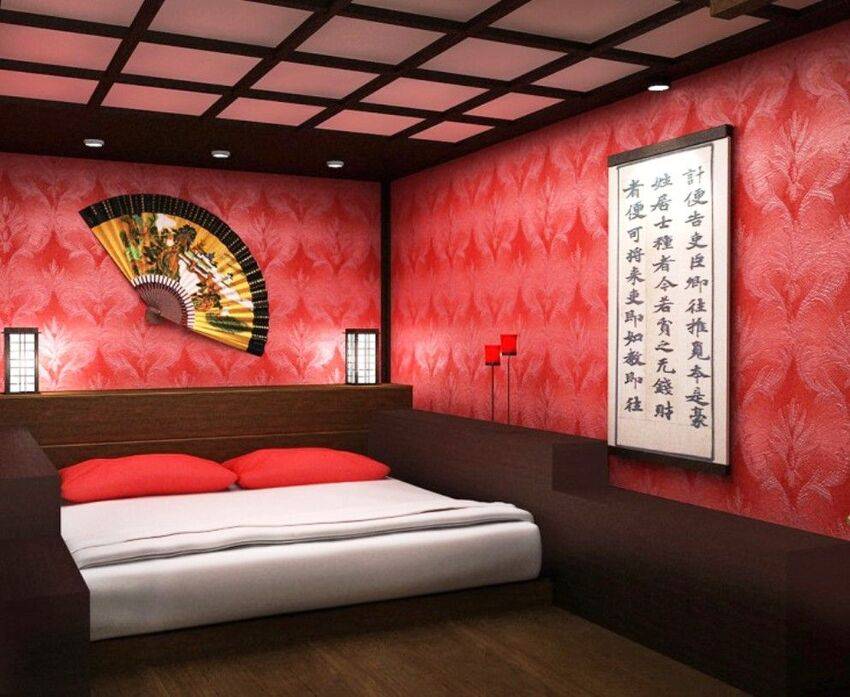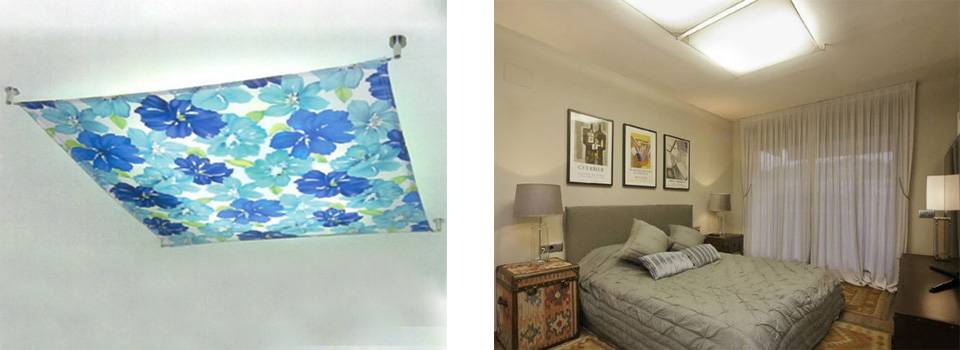Сейчас особой популярностью у дизайнеров и владельцев комнат с невысокими потолками (ниже 2,4 м) пользуются необычные -экраны с текстильным полотном, скрывающим источники света – энергосберегающие лампы. Цветов и вариаций принтов экранов превеликое множество. Они вполне легко поддаются снятию, стирке и при необходимости – замене. Так же, при низких потолках удачным решением будет на замена потолочной люстры настенными светильниками или встраиваемыми алюминиевыми профилями со светодиодной лентой внутри, которые вполне подойдут для создания общего освещения небольшой спальни.