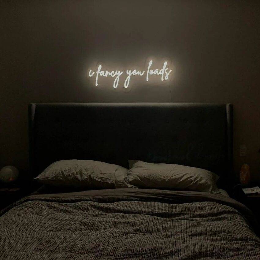 Неоновые вывески. Этот вариант отлично подходит для современных спален, в которых можно организовать необычные эксперименты. Неоновые композиции будут хорошо смотреться на фоне темных предметов интерьера. В качестве декора можно сделать тематическую надпись, которая будет актуальна для хозяев.
