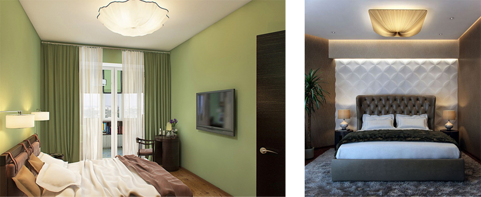 равномерно распределяемыми рассеянными лучами света, отраженными от потолка. Так что первое, что в любом случае придется сделать обладателям более-менее просторных спален – установить подходящий потолочный светильник общего освещения, который не создает глубоких теней, резких границ перехода света, раздражающих световых пятен и бликов. Под потолком в нашем случае совсем не место помпезной хрустальной или загадочному футуристическому светильнику-медузе, оснащенному хороводом многочисленных . Мягкое свечение и оптимальное рассеивание достигается благодаря наличию плафона из непрозрачного матового или даже молочного стекла или текстильного абажура нейтральных пастельных тонов, создающих милую уютную атмосферу, или даже в темном фиолетовом или черном исполнении, навевающем некоторую таинственность и романтический флер.