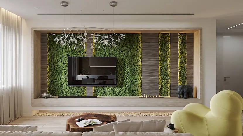 Темная вагонка неплохо смотрится с плитами для фитостены. Это актуально для эко-стиля, особенно если в дизайне присутствует камень или другой природный материал.