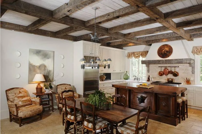 Потолок из вагонки в помещении в стиле «кантри» или «прованс» нужно выкрасить в белый цвет, а балки сделать темными.