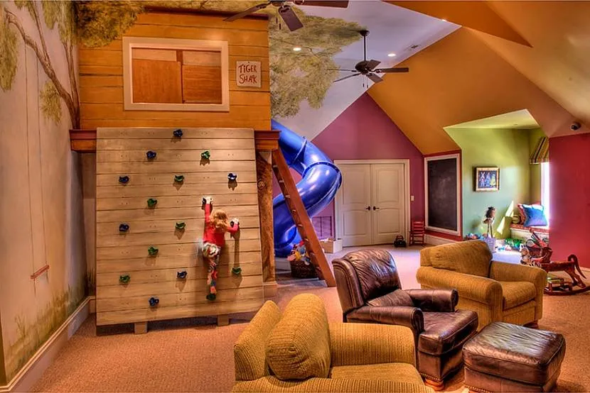 Если дом имеет мансарду, то ее наклонные стены оклеивают обоями, а потолок обшивают вагонкой неброских цветов, чтобы дополнительно не загружать комнату.