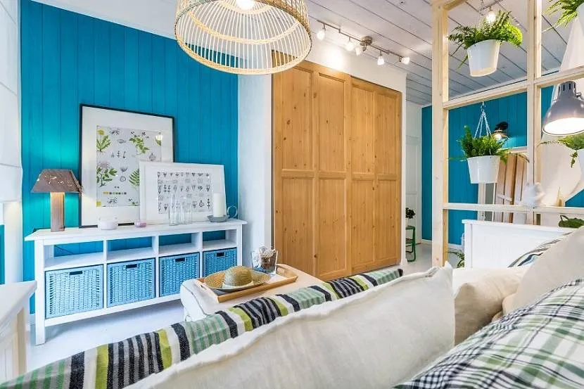 Если часть комнаты отделать нежно-розовой или нежно-голубой вагонкой, то в сочетании с яркими фасадами мебели, это придаст комнате особый уют и тепло. По краям вагонки монтируют багет, чтобы разграничить материалы отделки.