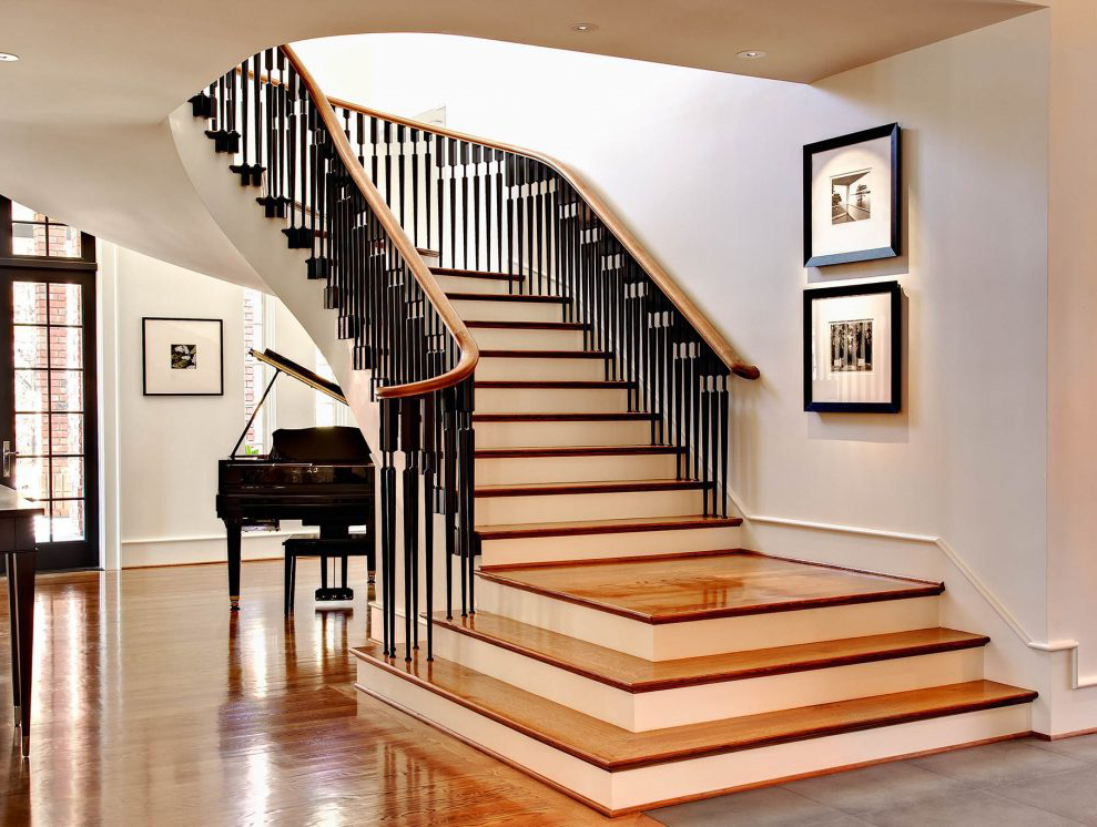 Поручни лестницы должны быть высотой 90 см. Если вам нужны дополнительные поручни для детей, их устанавливают на высоте 60 см. Для лестницы шириной более 110 см. рекомендуется установить поручни по обе стороны. Обычно ограждение лестницы заполнено балясинами (крепления в виде столбиков соединяющие перила со ступенями) из дерева в виде различных форм, но бывают и исключения, так, современные деревянные лестницы сочетают в себе металлические, ажурные ограждения.