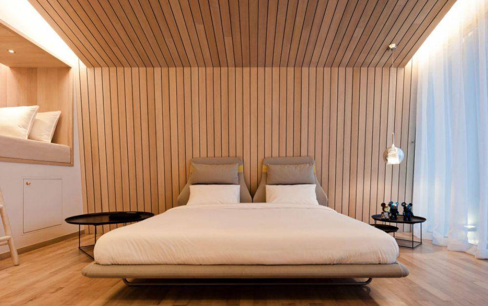 Смонтировав элементы обшивки параллельно короткой стене, можно зрительно расширить комнату. Чтобы оживить интерьер, используется укладка планок по диагонали