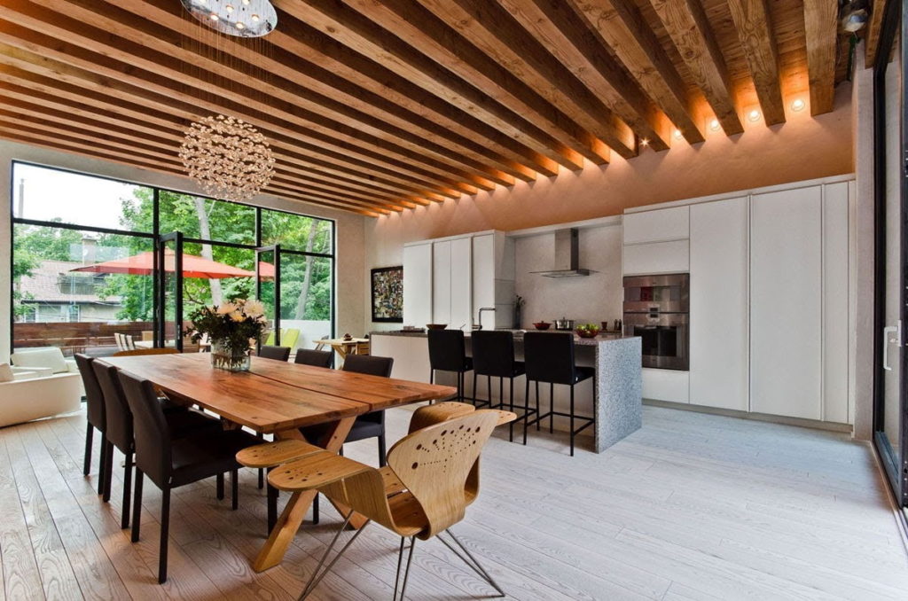 При выборе материалов для деревянных конструкций, учитывается форма потолка. Если плоскость расположена выше балок, выступающие детали обыгрываются как декоративный элемент, – окрашиваются в темный тон, а вся базовая площадь покрывается светлым оттенком. Очень хорошо применить кассетную облицовку – поверхность получается с впадинами, выглядит это необычно и привлекательно.