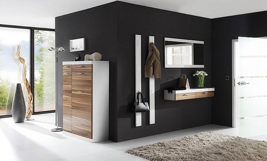 В качестве мебели рекомендовано использовать открытую вешалку с многочисленными крючками, полками и антресолью, пуфик с ящиком внутри и прочие предметы, с максимальной вместимостью и минимальными габаритами. Зеркало в такой прихожей можно расположить непосредственно на входной двери. А чтобы не «ломать голову» над выбором надёжного способа крепления такого хрупкого предмета, можно использовать уже готовую конструкцию, широкий выбор которых предоставлен почти в каждом из мебельных магазинов.