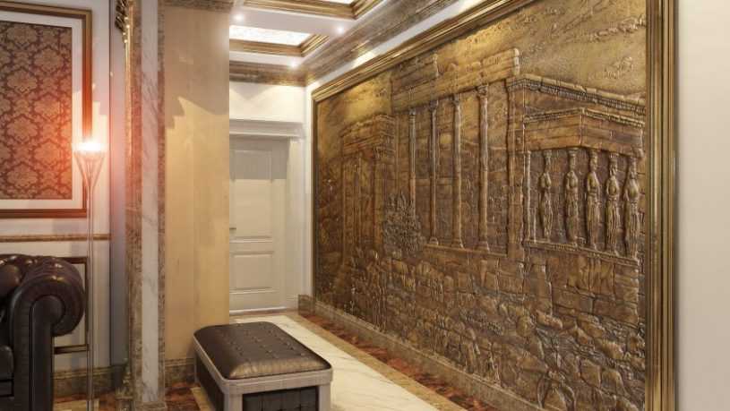 Гипсовый декоративный камень в сочетании с гипсовым панно в коридоре — восточная стилистика