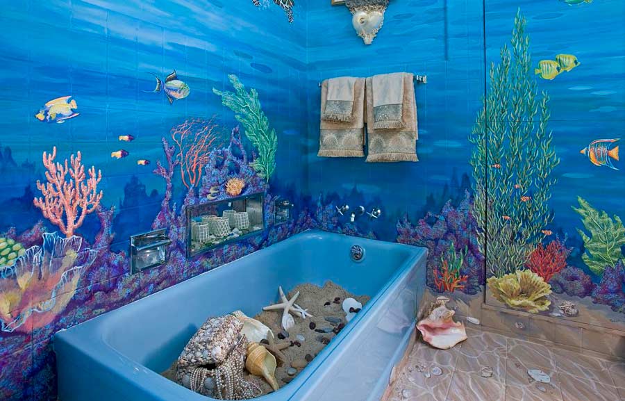Для фантазеров, кто, лежа в ванной, представляют себя на берегу моря, расслабляясь после тяжелого дня, также имеется выбор из разнообразных рисунков и картин на панелях на эту тематику.