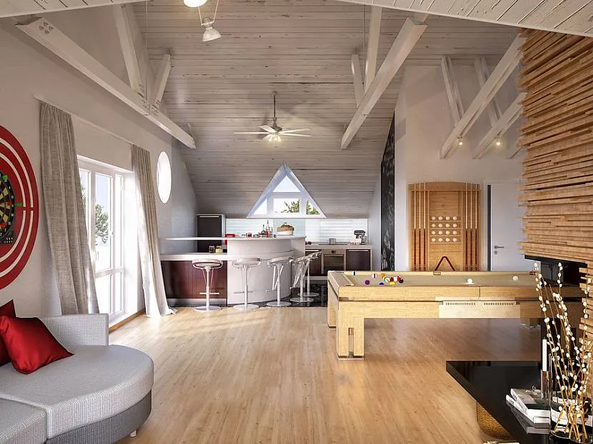 Для создания чердачной атмосферы подойдет белый потолок, или обшитый досками (если там есть провода или трубы, то не стоит их прятать). Для стен подойдет имитация кирпичной кладки или бетонной стены. На пол чаще всего используется деревянная доска или ламинат.