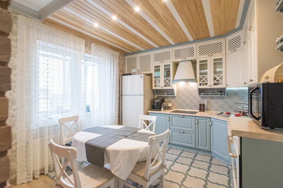 Для этого стиля подходят универсальные мотивы с переплетением нежных оттенков. Потолочное покрытие стоит выбирать полированное. Цвета максимально натуральные или белые. Выкладка простая. Вагонку часто используют классическую или евро.