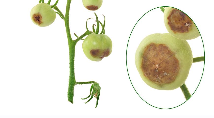 На листьях образуются крупные коричневые пятна, побеги загнивают. Плоды при повышенной влажности покрываются бурыми, увеличивающимися в размерах мокрыми пятнами с плесневидным серым налетом.