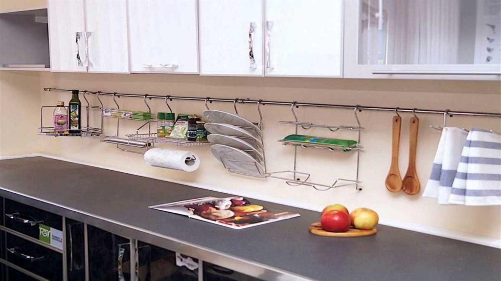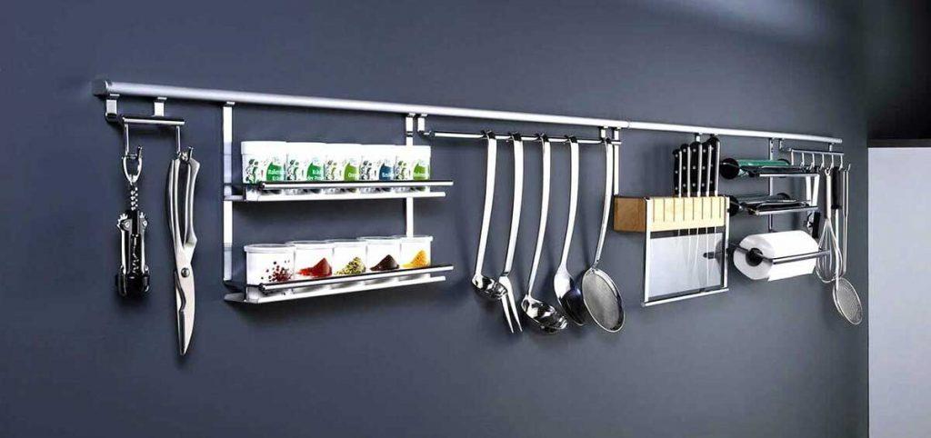 На неё можно подвешивать на крючках прихватки, лопатки и половники, лёгкие полки для хранения специй. Использование такой детали с маленьким кухонным гарнитуром также помогает экономить место.