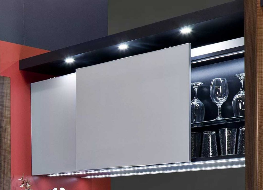 Есть и иной вариант – подъёмные фасады. Но они требуют наличия высокого потолка. Фасадная часть немного выдвигается вперёд и уходит кверху.
