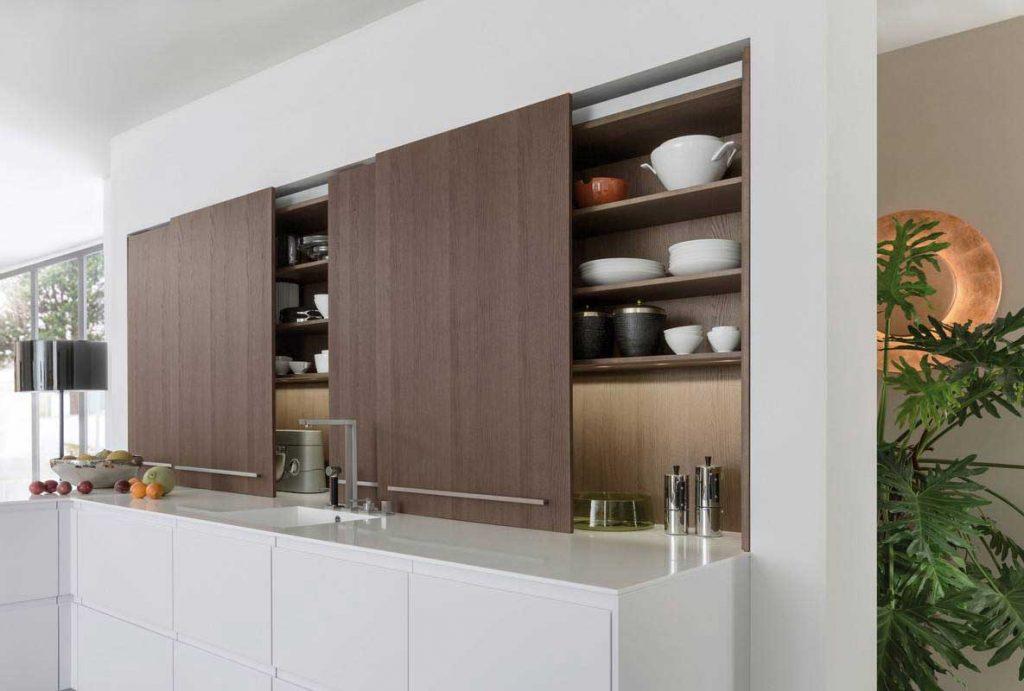 Ещё один тип – раздвижные фасады со створками, перемещающимися по направляющим. При открытии одна из створок отъезжает в сторону. Такая конструкция монтируется сложнее других, зато не требует ни наличия места спереди, ни высокого потолка.