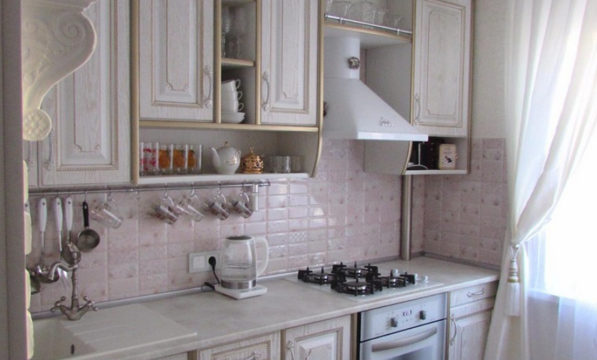 Классический стиль предполагает мебель с тяжелой структурой дерева и отличается массивным декором на фасадах. Для небольшого помещения это неуместно. Если все же хочется отдать предпочтение классике, то нужно постараться максимально облегчить интерьер. Например, стоит использовать в качестве фона белый или кремовый, выбрать матовые фасады с филенками и лаконичными ручками, ограничить декор шторами с традиционным для стиля принтом.