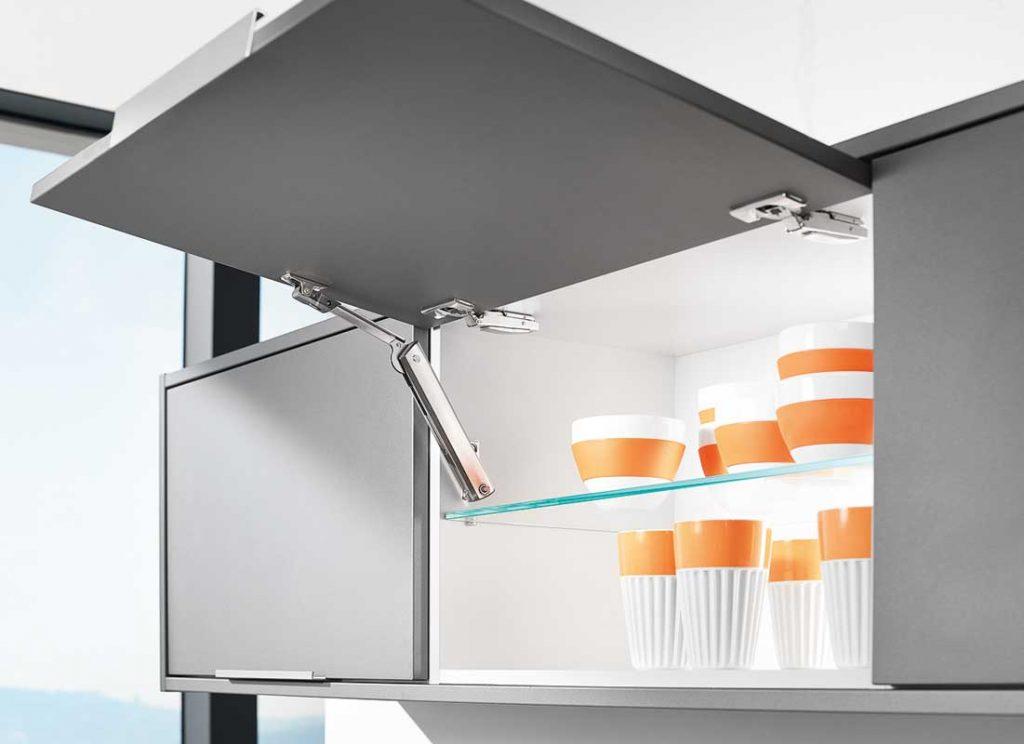 Возврат в первоначальную позицию также происходит плавно и не сопровождается стуком. Такие конструкции часто применяют для вытянутых навесных шкафов.