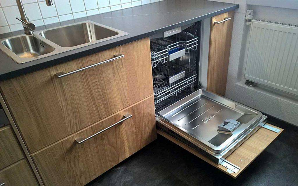 Когда в гарнитуре не очень много тумб и шкафов, такое размещение машины точно не сделает помещение тесным.