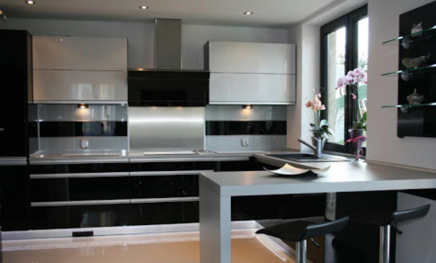 В дизайне современной кухни часто применяют светлые тона. Белая модель не только смотрится очень привлекательно, но и способствует визуальному расширению комнаты. Оригинально в интерьер будут вписываться конструкции в черных, бордовых или кофейных тонах.