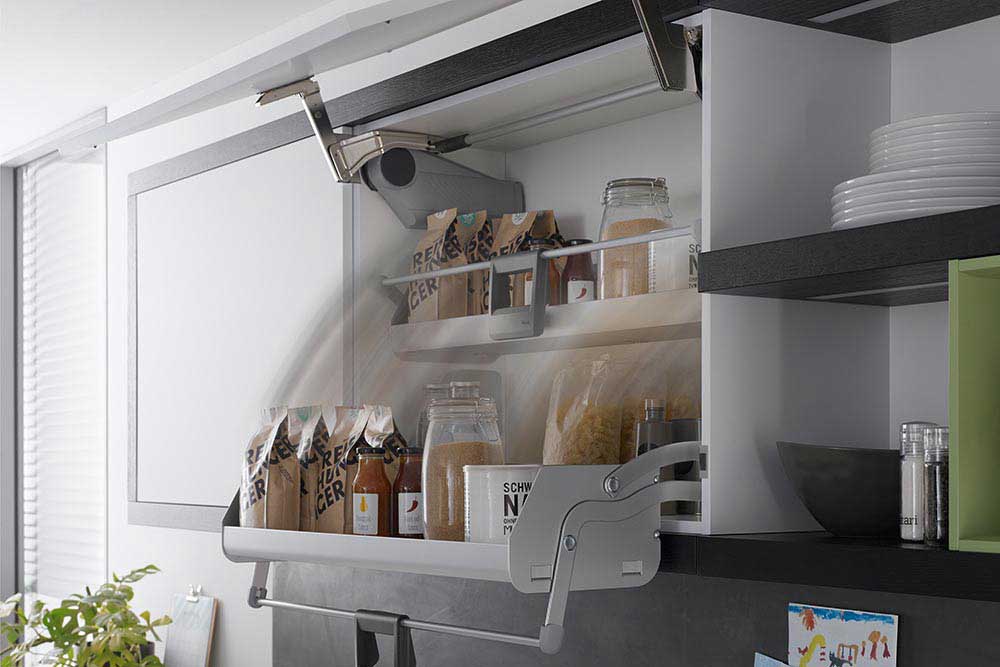 Альтернативой может быть дверка, откидывающаяся кверху посредством специальных креплений – газлифтов. Они поддерживают фасады в поднятом положении без привлечения человеческих рук.