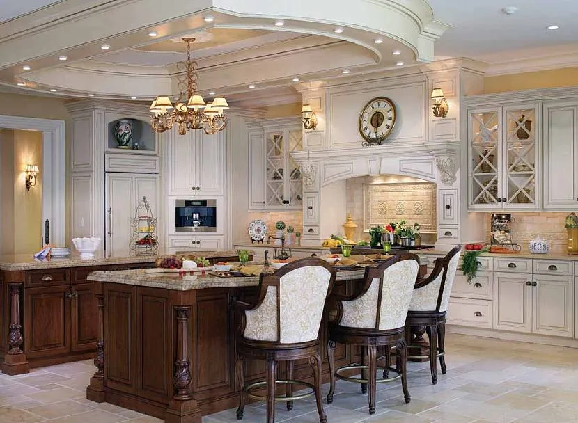 Позолоченная фурнитура, люстра и прочие аксессуары прекрасно выделят акценты в кухне и подчеркнут красоту гарнитура.