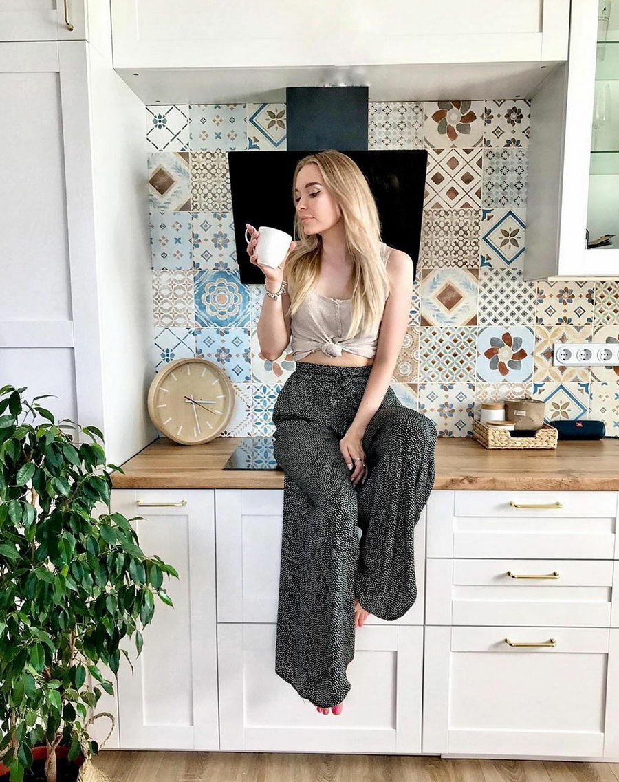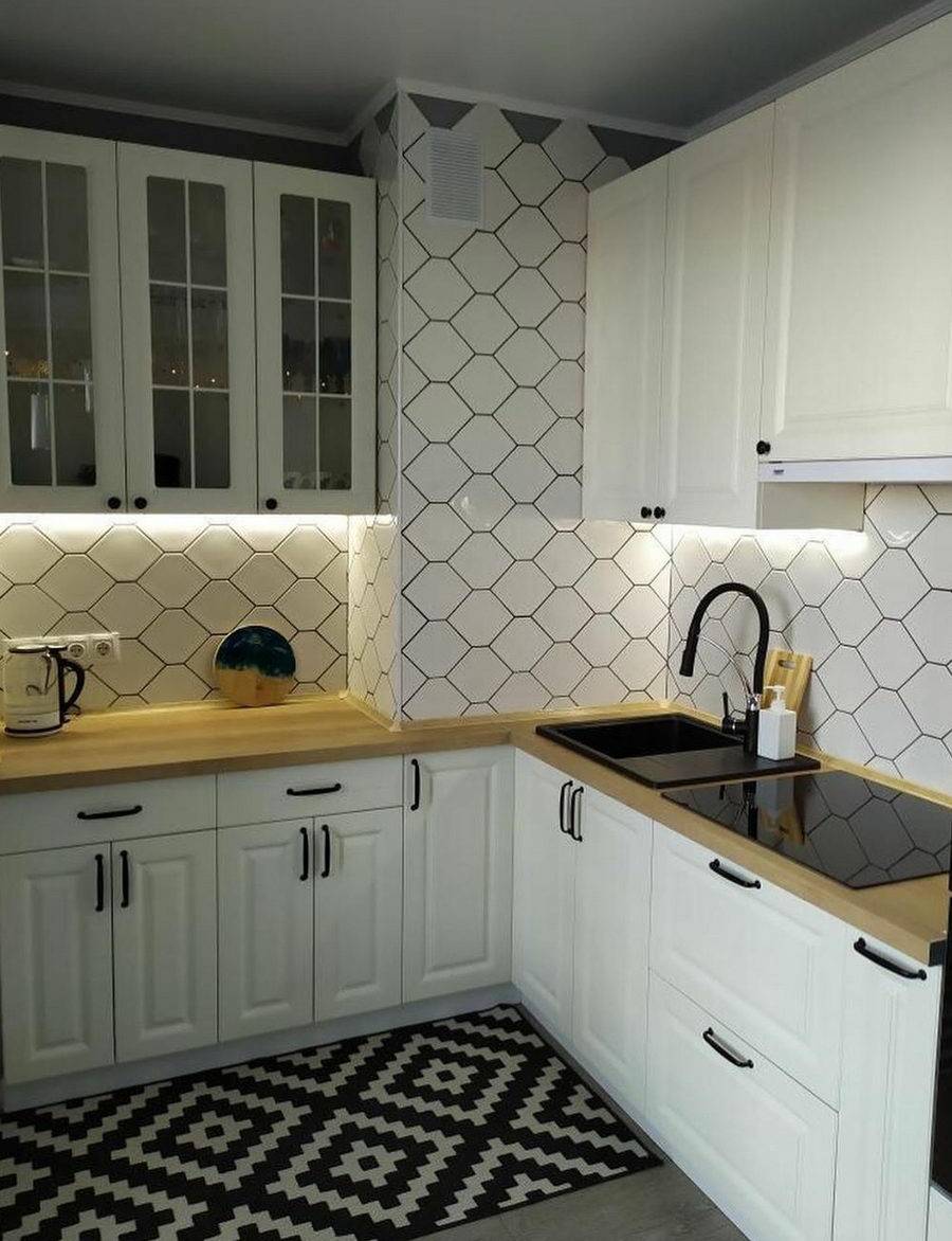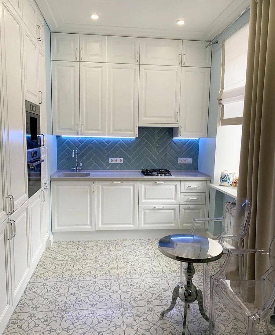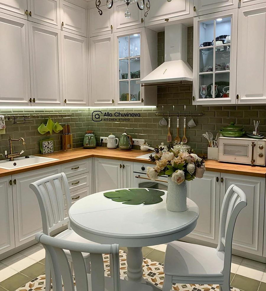 - Узоры. Белая кухня — идеальный фон для использования узоров на плитке фартука, пола или чем угодно ещё. Состаренные узоры сейчас ещё и в моде.