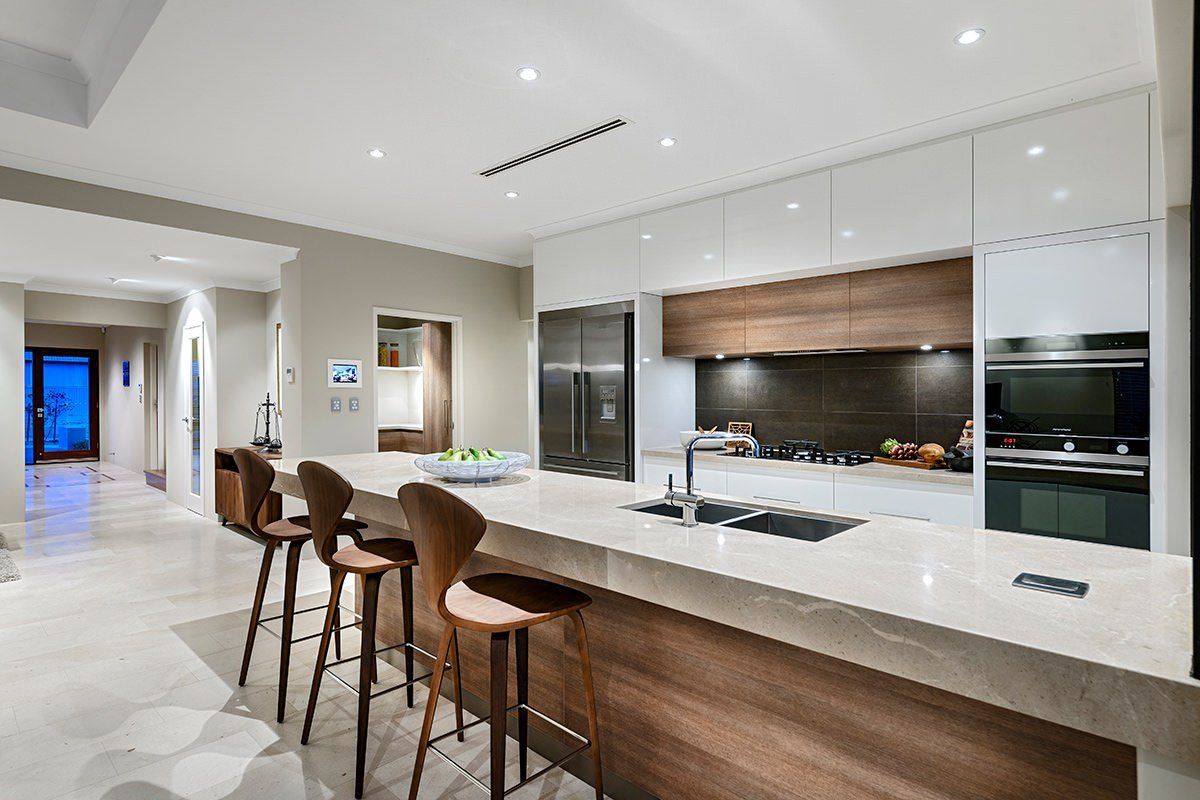 Принципиальное отличие барной стойки от острова в том, что на неё не выносится ни мойка ни варочная поверхность, и за ней можно сидеть на барном стуле благодаря наличию места для ног.