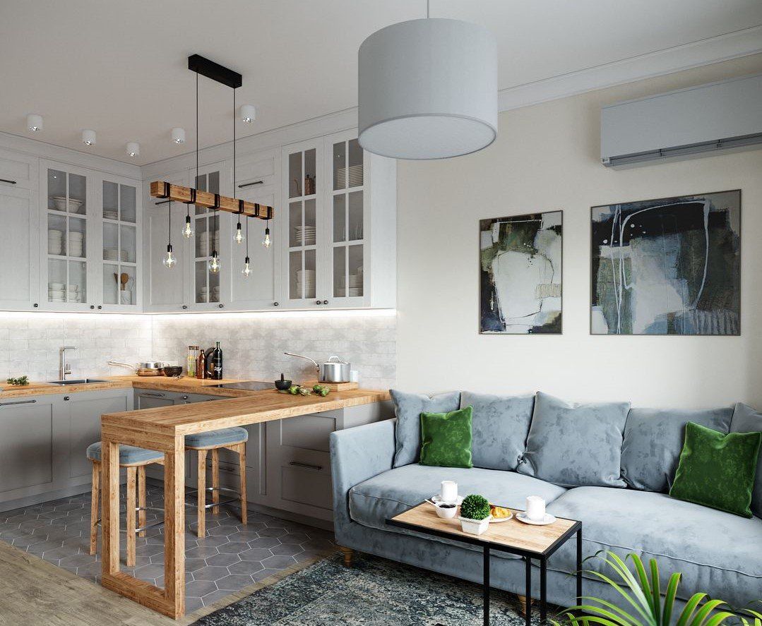 По планировке кухни с такой барной стойкой обычно объединяются с гостиной, либо размер изначально должен позволять подходить к ней с 2-ух сторон.