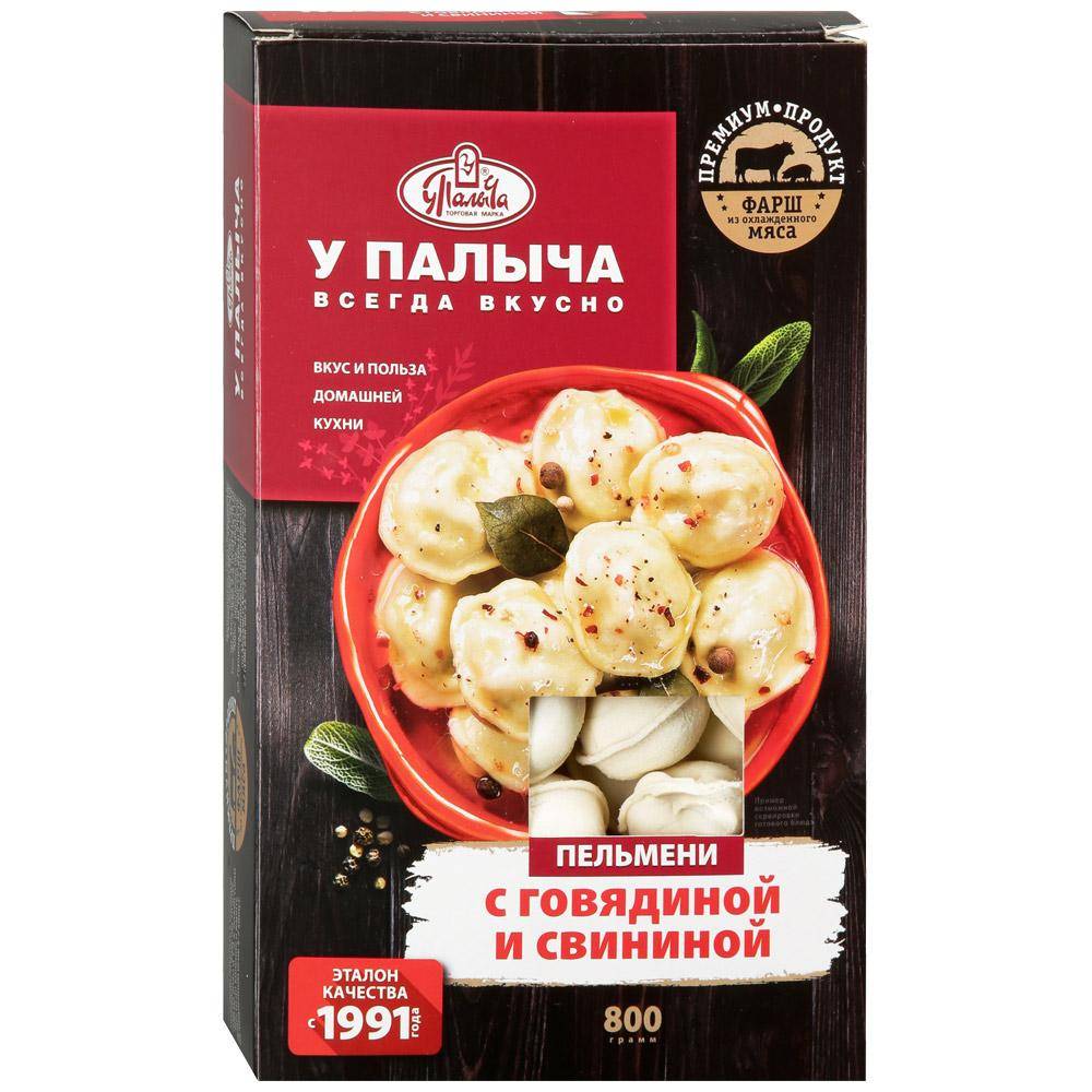 Хорошие марки пельменей этой стоимостной группы открывает бренд «У Палыча». Полуфабрикат упакован в довольно вместительную ярко оформленную коробку из картона. Благодаря вставке из прозрачного полиэтилена можно оценить качество лепки. Стоит сразу отметить, что заготовки ровные, словно на подбор. Имеют привычную круглую форму.