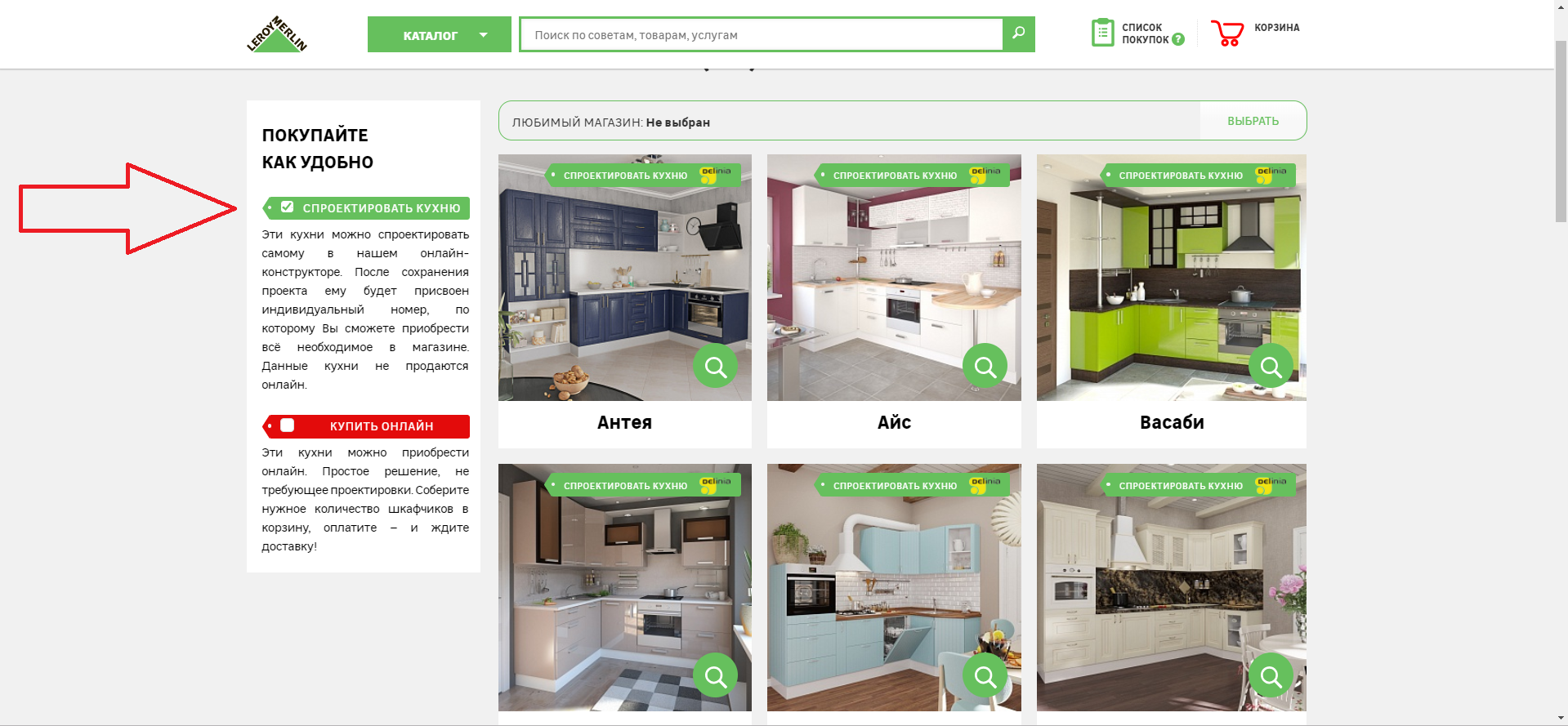 Создание собственного гарнитура начинается на сайте leroymerlin.ru/proekt-kuhni/. На главной странице выбираем «Спроектировать самостоятельно».