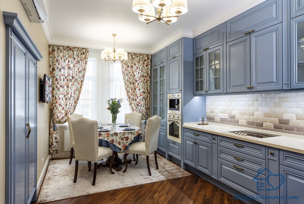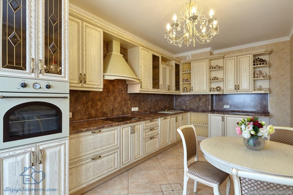 - Для кухонь в стиле кантри, классика, прованс и шебби-шик подойдут деревянные лакированные модели, возможно, с резьбой или узорами, натурального древесного или белого цвета.