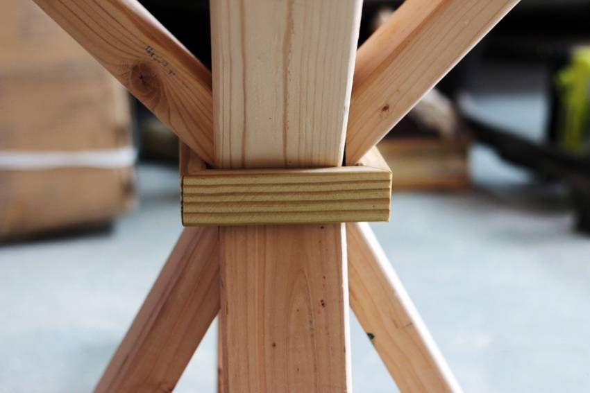 Можно укрепить конструкцию посредством нагелей, соединив ими бруски крестовины и столешницу. Помимо этого, необходимо зафиксировать ножки на расстоянии 20–30 см от пола дополнительными планками, расположив их крестообразно или последовательно. Все выступающие шляпки крепежей рекомендуется закрыть заглушками, чтобы изделие выглядело гораздо эстетичнее.