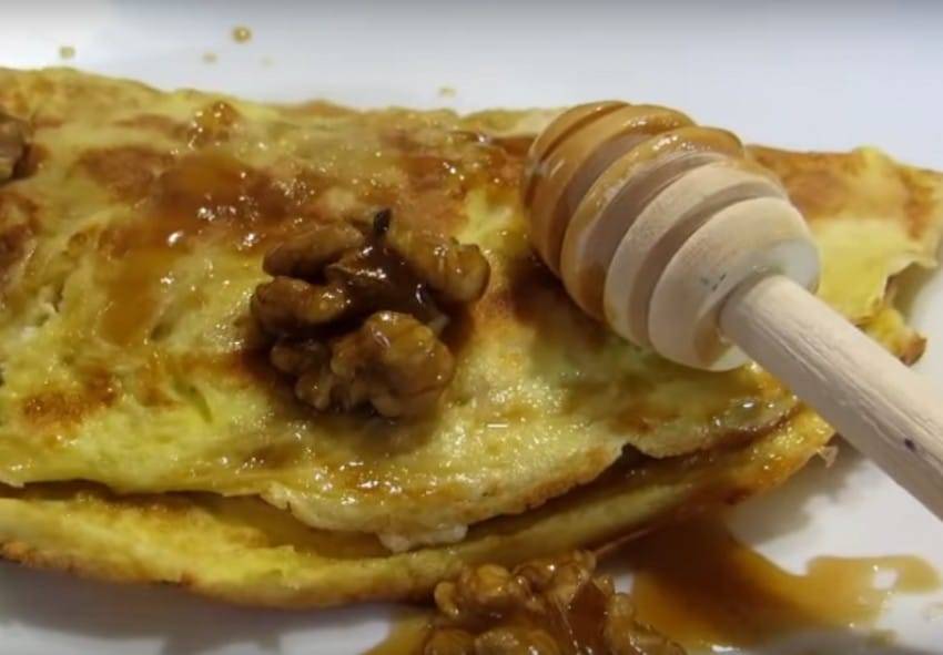 - На сковороде с антипригарным покрытием (обязательно сухой) пожарить панкейки с обеих сторон, готовятся они быстро. Подавать с медом.