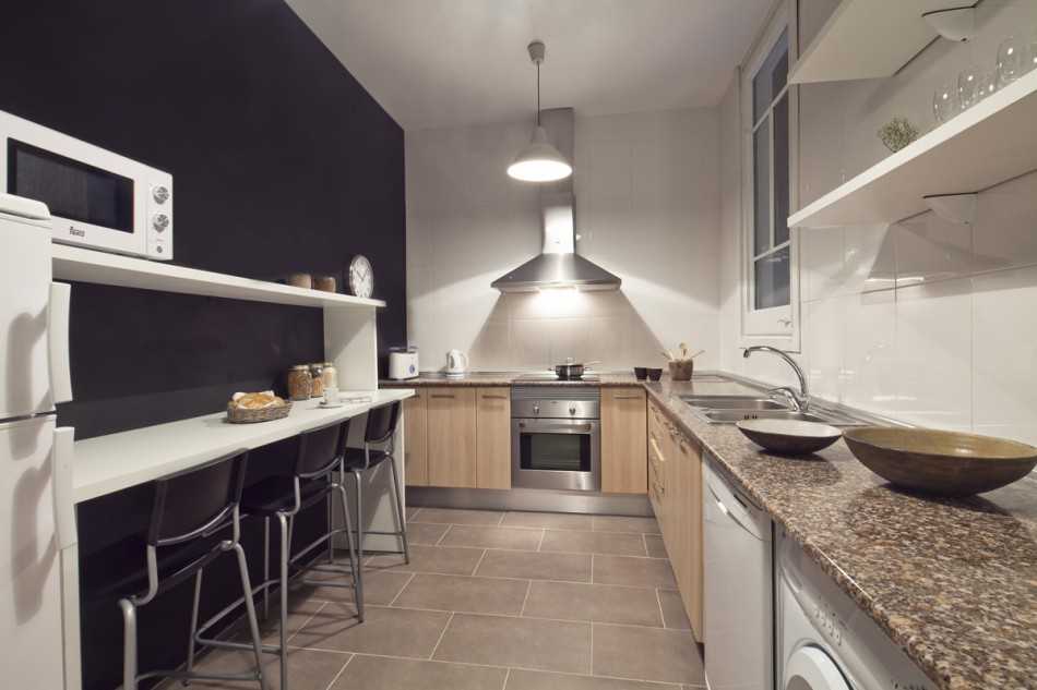 Двухрядный гарнитур будет хорошим решением в узкой кухне 9 кв.м, если требуется много рабочей поверхности и мест хранения. Для организации обеденной зоны есть несколько практичных решений ‑ барная стойка, пристенноый навесной стол, стол-подоконник.
