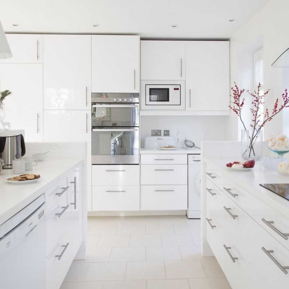 Для белой кухни без ручек идеально подходит постформинг. Он сглаживает прямые углы, создает более плавные и привлекательные линии. Еще один вариант кромки — алюминиевая. Она защищает от механических воздействий и повреждений, гармонирует с белым и его оттенками.