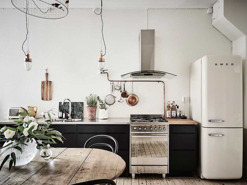 В кухонном пространстве 9 кв самым большим предметом является холодильник. Удобным местом для размещения агрегата станет правый или левый угол возле окна. Для экономии свободной площади приобретают узкую и высокую конструкцию. Еще один вариант — установить холодильник рядом с дверным проемом или в нише.