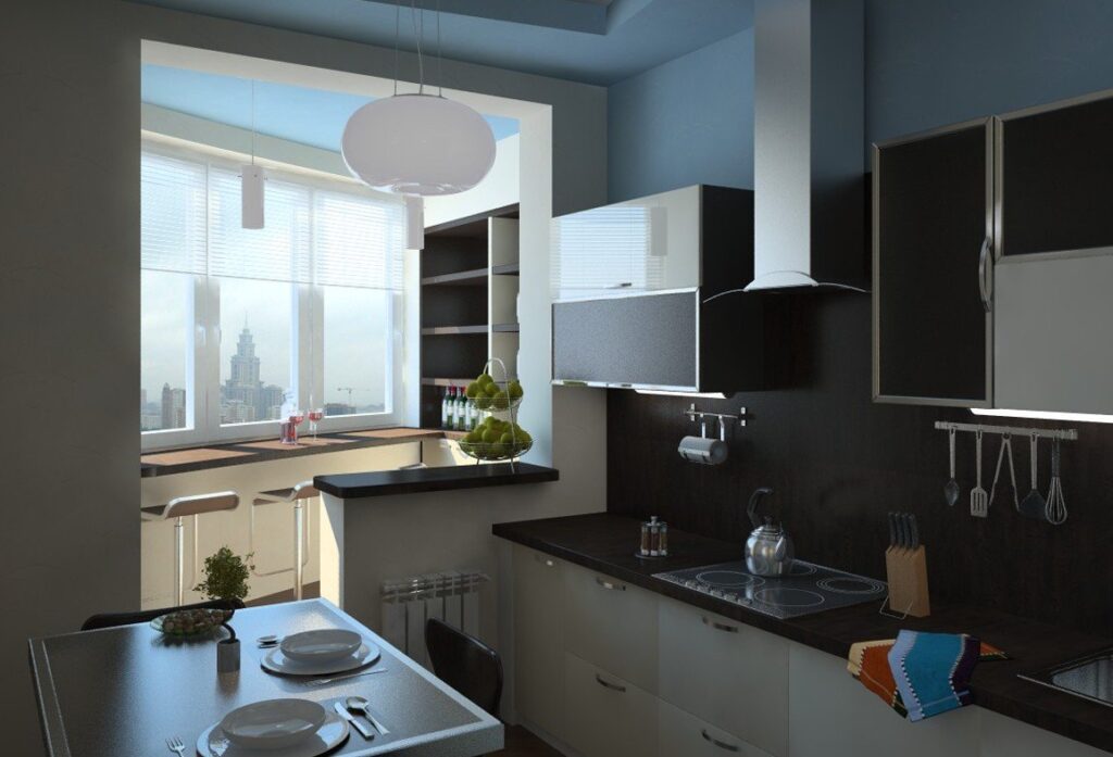 - балкон можно совместить с кухней, тем самым увеличив площадь комнаты;