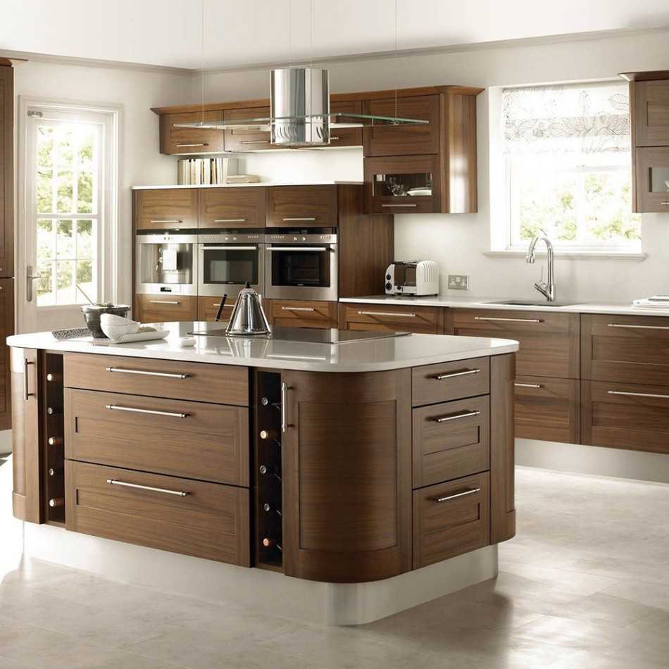 Островная планировка предполагает размещение гарнитура вдоль стен и вынесение отдельного блока в виде острова в центре помещения. Так как здесь требуется много свободного пространства, использовать этот вариант получится только если кухня имеет квадратную форму. Достоинством этого варианта будет удобство и функциональность. Недостатком является то, что использовать этот способ получится только в просторной кухне-гостиной с достаточным количеством свободного места.