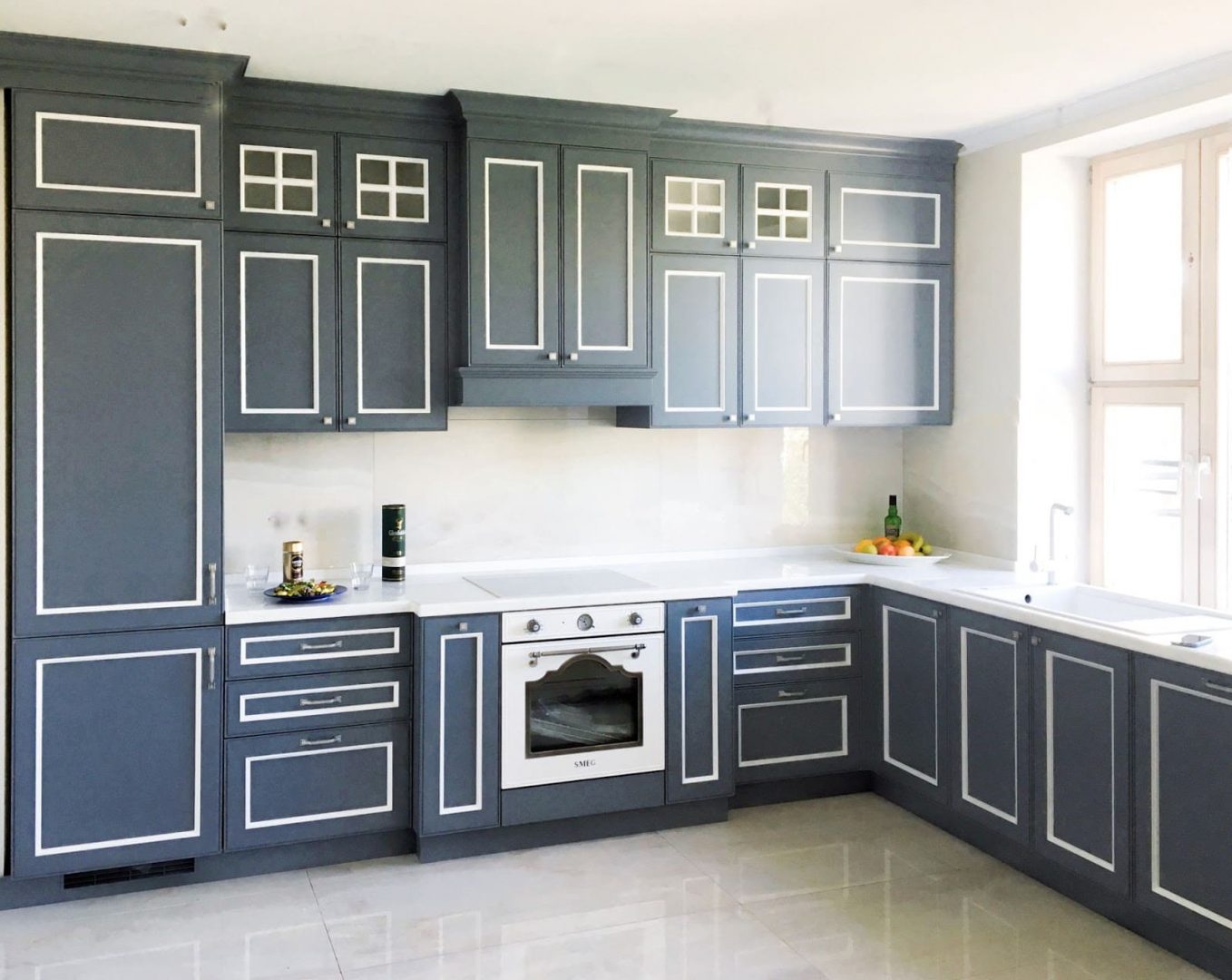 Кухонный гарнитур можно разместить стандартно в виде буквы «Г». На количество секций кухонного гарнитура влияет количество членов семьи, наличие домашних питомцев и объем различной утвари.