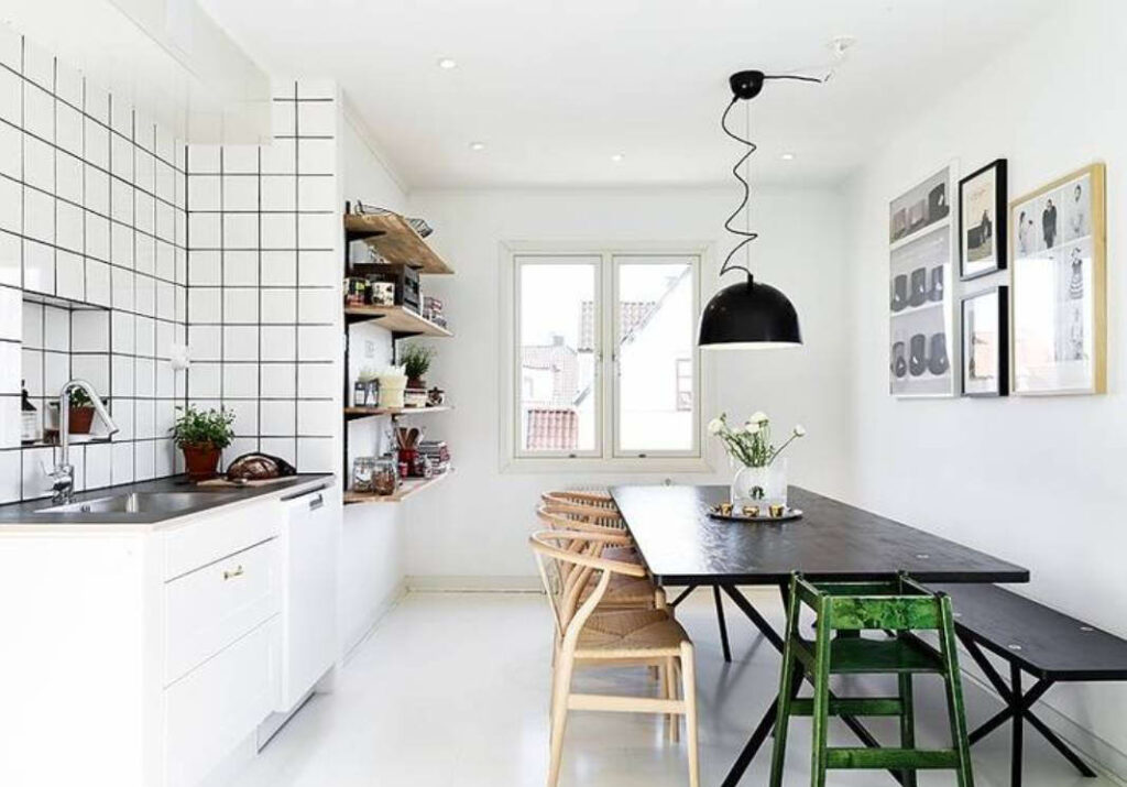 Если вы думаете, что белое пространство может выглядеть очень просто, вы можете добавить некоторые эксцентричные детали. Например конструкции светильника с яркими цветами или с интересными материалами наподобие древесины. Подберите правильные аксессуары, и у вас будет уютная кухня в скандинавском стиле