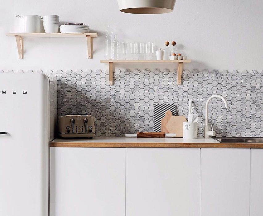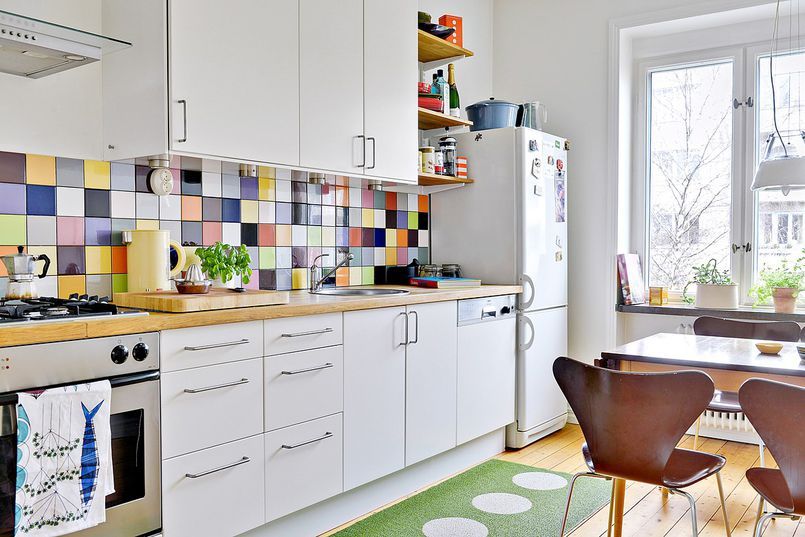 В истинном скандинавском стиле, если у вас есть полностью белая тематическая кухня, лучший способ добавить цвет- это внедрить различные предметы яркой мебели. Например, выбрать подходящий по цвету холодильник, комнатные растения или яркие кофе-машины, которые добавляют оттенок цвета, не выходя за его пределы.