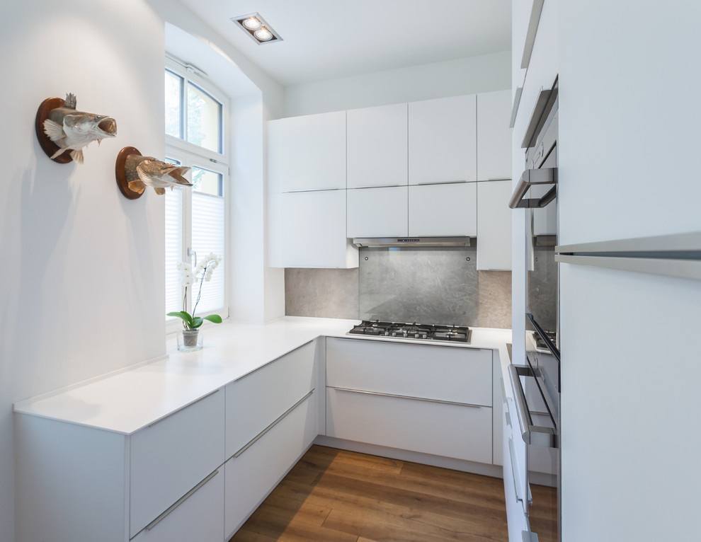 Каждая смежная стена призвана выполнять свою задачу. Например, первая зона – у окна, там находится раковина; вторая зона – на соседней стене, здесь готовится пища на столешнице и варочной панели; третья зона – рядом, на этой стене располагаются системы хранения, шкафчики, холодильник.