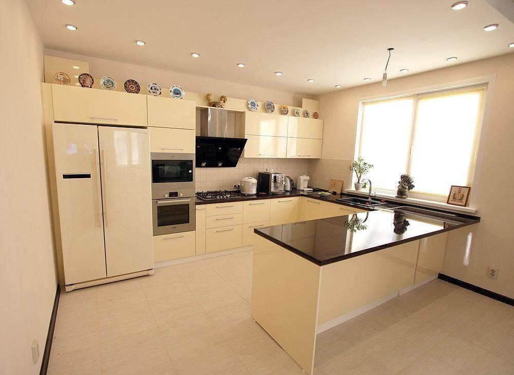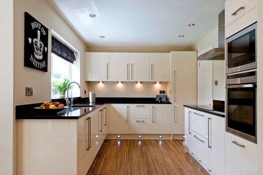 При выборе освещения опирайтесь на квадратуру помещения. Для начала оцените высоту комнаты, ее ширину и глубину. Если же у вас п-образная кухня с окном, то, нужно заметить, что потребуется учет его размера, дизайна и интенсивности проникающего естественного света.