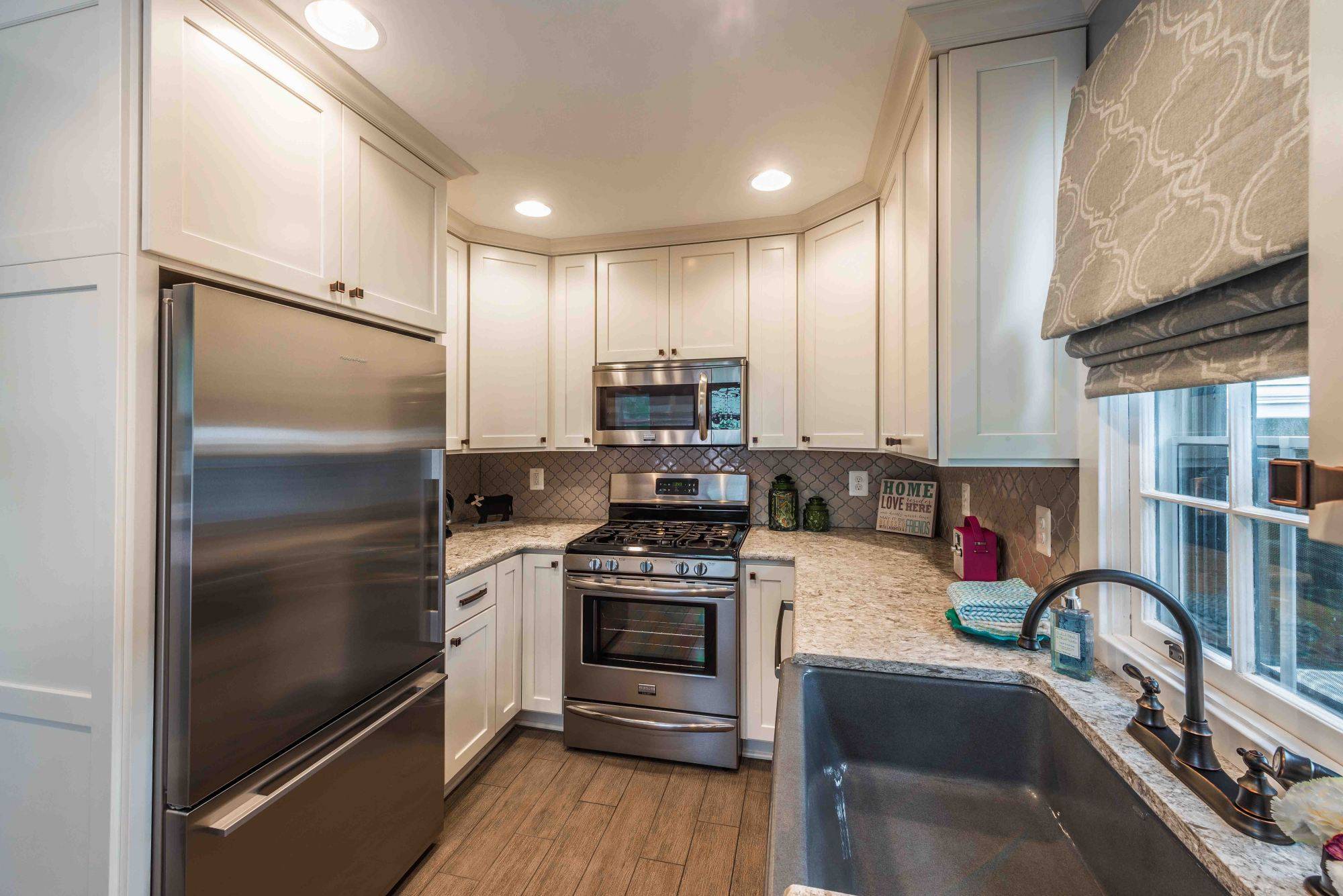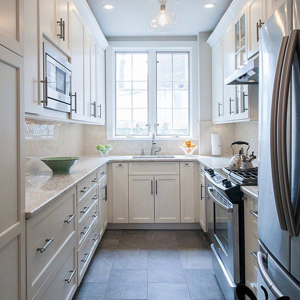 Много естественного света на кухне с двумя рабочими зонами вдоль противоположных стен, помогает создать функциональный и светлый интерьер